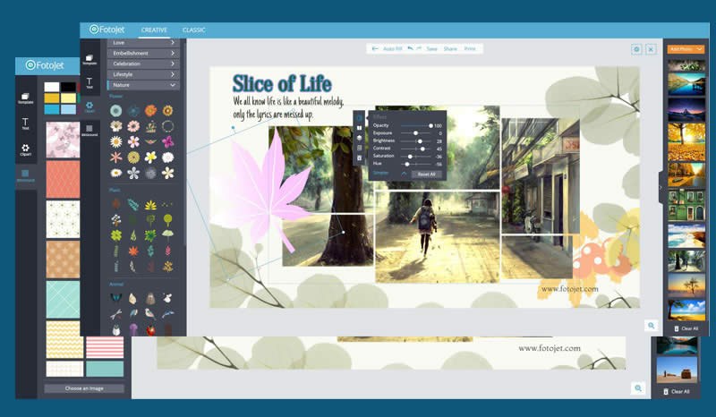 It's time to add your own photos to your design. Click Add Photo, you are able to add photos from your local computer folders or Facebook albums. All your added photos will be tidily displayed in the right photo list. You can easily drag the one you like into the main canvas. Then adjust the photo with the provided features like effect, crop, flip, etc.