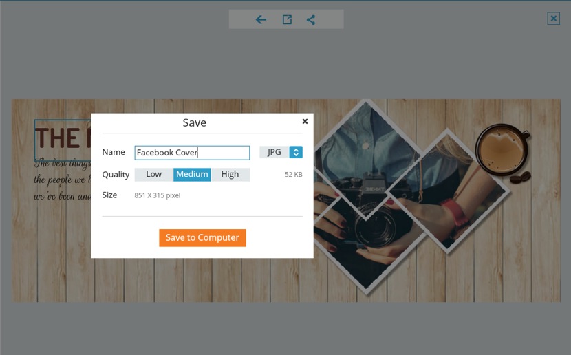 When you have your last satisfaction at your Facebook cover design, now save it on your computer. You can rename your design and also set the quality of the file as Low, Medium, and High. After that, upload this design to your Facebook as a timeline cover.