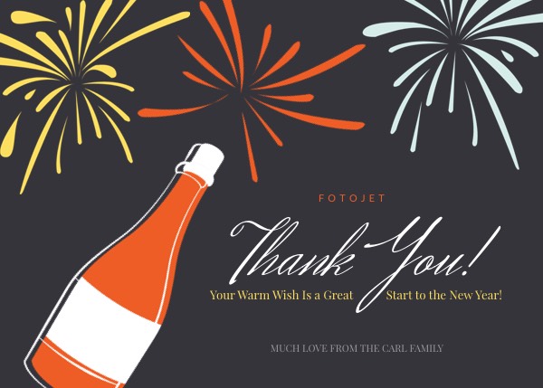 You may get a lot of warm wishes from friends and family in this holiday, now it is time for you to say thanks for them. This neat and eye-catching New Year card template, with firework illustrations, is ready to help you make custom New Year cards. You can make a few changes to the template using easy editing feature, such as decorating the text with different fonts and replacing the firework images with other designs. You'll be happy to discover how fun and easy it is to design New Year thank you cards with FotoJet.