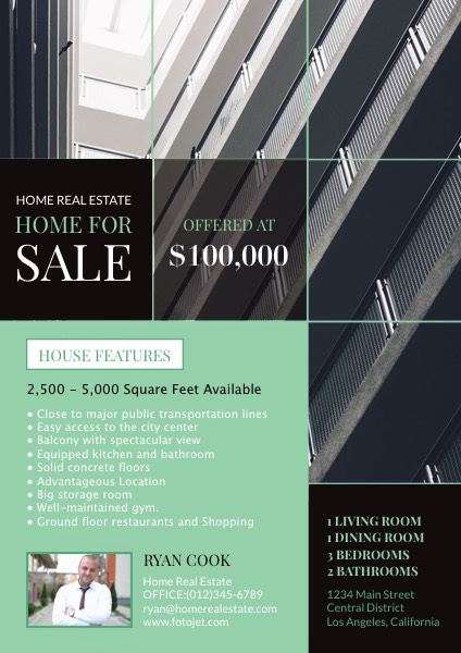 If you have apartment houses for sale and want to make some attractive marketing materials. This real estate flyer template will easily come into your notice. Its embedded apartment image, listed house features and arranged information text can make the design stand out. Most importantly, all elements on the flyer design template are customizable, so it is easy to upload your images and change the text to make real estate flyers for your properties.